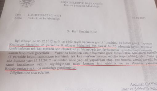 Kılıç, elektrik almak için çaldıkları her kapıdan her seferinde eli boş döndüklerini belirterek “Herkes geceleri aydınlıkta bizler ise karanlıkta yaşıyoruz. Evimizin tüm evrakları olduğu ve Aydın Büyükşehir tarafından kapı numarası dahi aldığımız halde elektriğimizi bağlatamadık. Ben kanunlara uydum gerekli evraklar ile AYDEM'e dilekçemiz ile başvurularımızı yaptık. AYDEM (ADM)'e her gittiğimizde bizlere sadece bekleyeceksiniz diyorlar ama 2 yıl geçti halen elektriğimiz bağlanmadı. Bizler burada ülkemiz için çiftçilik ve hayvancılık yaparak üretiyoruz. Kendi imkanlarımızla kurduğumuz güneş panelleri ile azda olsa elektrik ihtiyacımızı karşılamaya çalışıyoruz ama yeterli olmuyor. Valiliğimize, Kaymakamlığımıza ve AYDEM yetkililerine başka çarem kalmadığı için buradan sesleniyoruz. Lütfen mağduriyetimizi giderin ve bizleri karanlıktan kurtarın." diye tepki gösterdi.