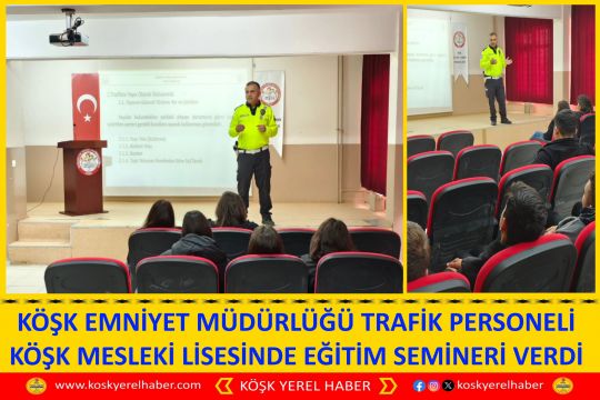 Köşk İlçe Emniyet Müdürlüğü’nde görevli trafik polisleri, Köşk Mesleki ve Teknik Anadolu Lisesi öğrencilerine trafik kuralları ve trafik güvenliği konusunda bilgilendirici bir seminer verdi.