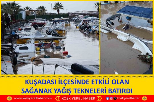 Kuşadası ilçesinde etkili olan sağanak yağışla beraber oluşan sel sebebiyle Davutlar Balıkçı Barınağı’nda bağlı tekneler zarar görürken, bazı tekneler battı.