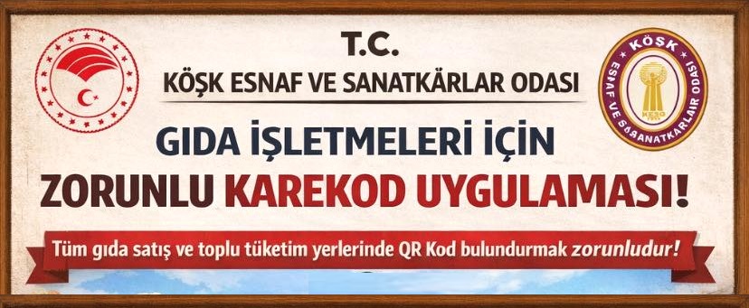 Bakanlıkça zorunlu hale getirilen bu ygulama sonrası Köşk Esnaf ve Sanatkarlar Odası Başkanı Ümit Açıkgöz Köşk Yerel Haber'e konu ile ilgili ; "Market, kasap, manav vb. gıda satış yerleri ve restoran, kafe, yemekhane vb. gıda toplu tüketim işyerlerine esnaflarımızın karekodlarını alarak işyerinin görünür bir yerine asması zorunludur. Esnafımızın cezai müeyyide ile karşı karşıya kalmamaları gıda karekodlarını bir an evvel odamızdan almaları önemle duyurulur." açıklamasını yaptı.