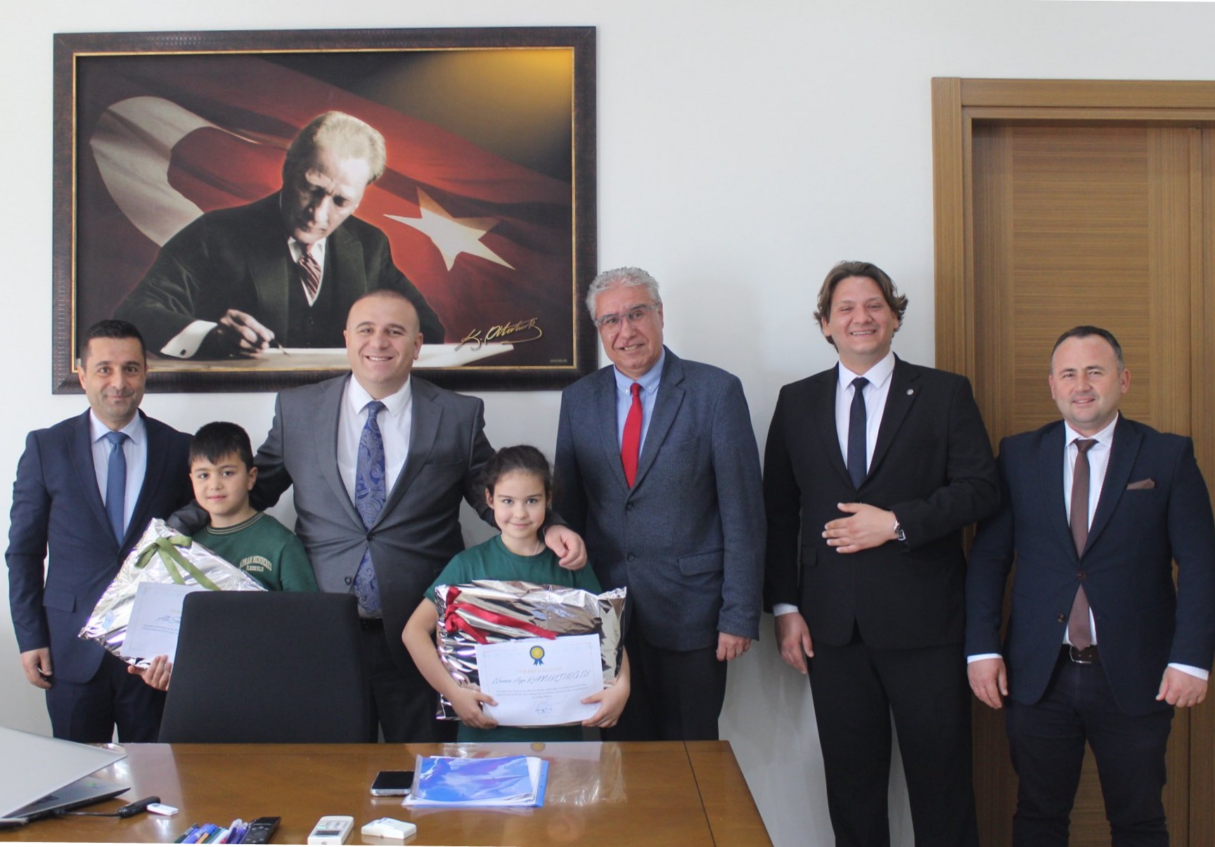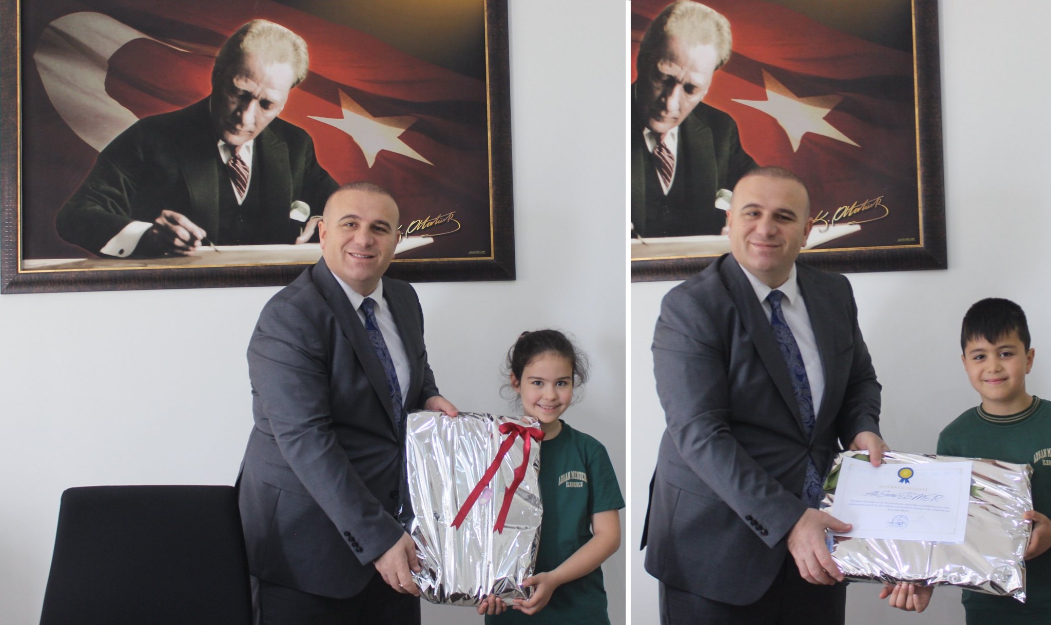 Köşk Atilla Koç Halk Kütüphane Müdürü Emre Durmaz tarafından öğrenci Ali Sezai Esmer ve Nazenin Ayşe Kavukçuoğlu için hazırlanan teşekkür belgelerini ve hediyelerini Köşk Kaymakamı Hasan Taş tarafından Köşk Kaymakamlığı binasında verildi.