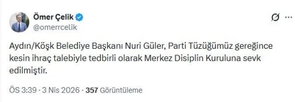 AK Parti Genel Başkan Yardımcısı, Parti Sözcüsü Ömer Çelik, "Aydın/Köşk Belediye Başkanı Nuri Güler, Parti Tüzüğümüz gereğince kesin ihraç talebiyle tedbirli olarak Merkez Disiplin Kuruluna sevk edilmiştir." dedi.