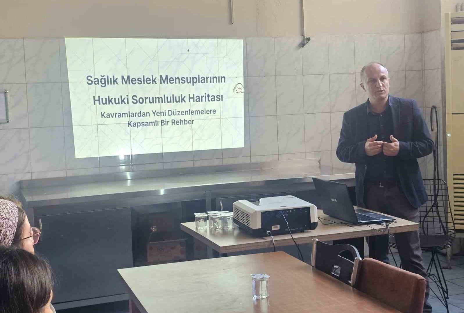 Aydın İl Sağlık Müdürlüğü Hukuk ve Muhakemat biriminde görevli avukatlar ile Mesleki Sorumluluk Kurulu İl Koordinatörü tarafından verilen eğitimde, sağlık çalışanlarının mesleki sorumlulukları ve hukuki süreçlerde izlenecek yollar detaylı şekilde ele alındı. Eğitim kapsamında, özellikle rücu işleyişi, idari ve hukuki sorumluluklar ile sağlık çalışanlarının görevlerini yerine getirirken dikkat etmesi gereken hususlar hakkında bilgilendirme yapıldı. Katılımcılara, karşılaşılabilecek hukuki durumlarda izlenecek prosedürler örnekler üzerinden anlatıldı.